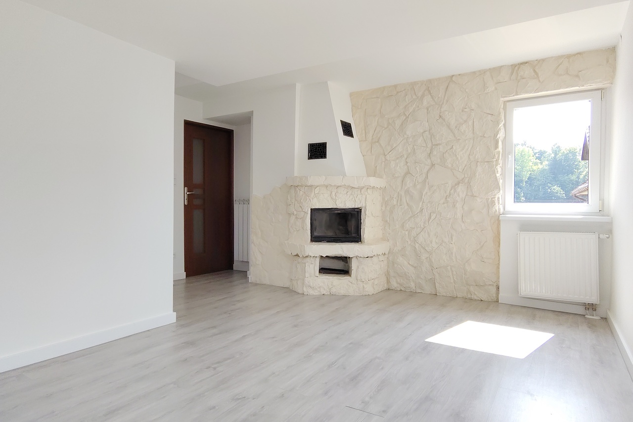 Na parterze znajduje się salon z kominkiem oraz otwarta kuchnia z aneksem kuchennym (kuchnia wyposażona w lodówkę, kuchenkę gazową z piekarnikiem oraz pralkę).