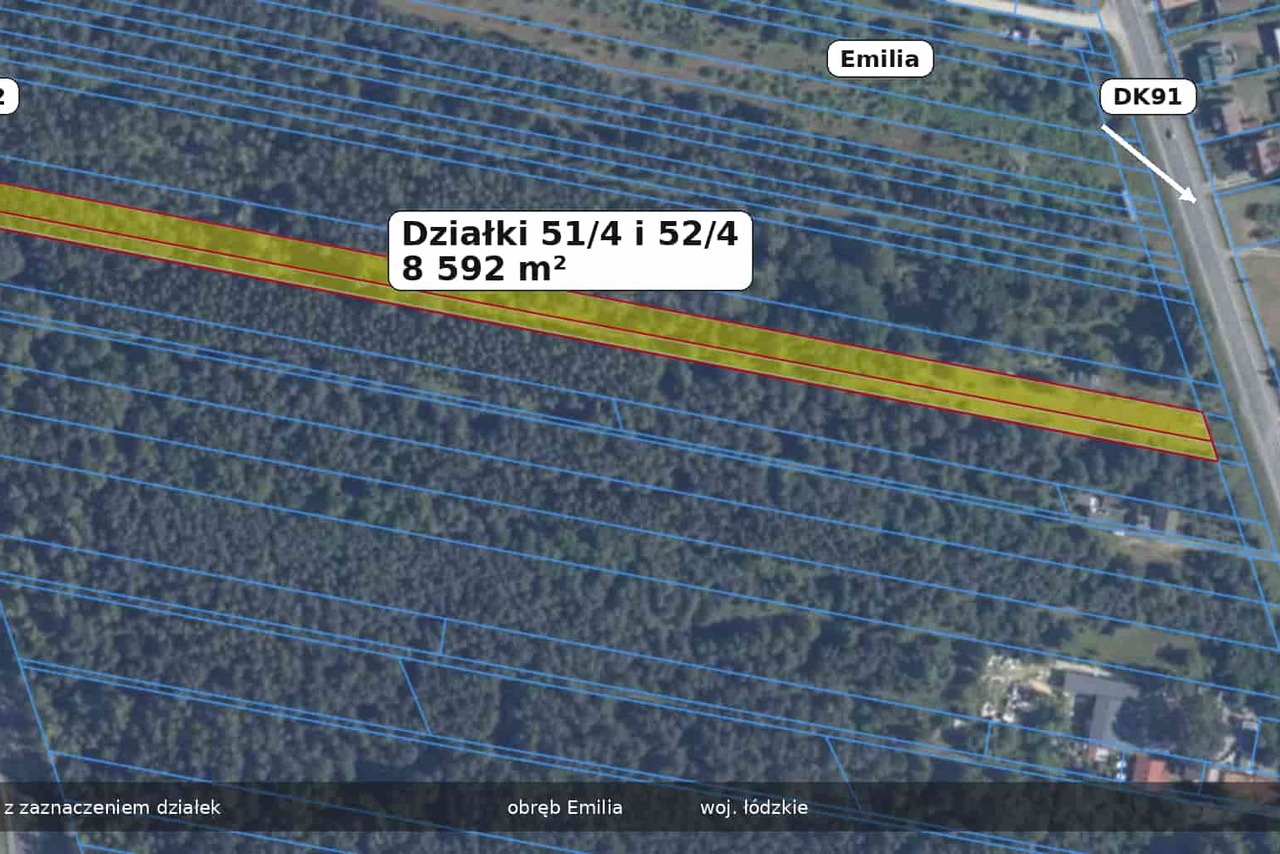 Na sprzedaż działka inwestycyjna położona w miejscowości Emilia, w bardzo dobrej lokalizacji komunikacyjnej – pomiędzy drogą krajową DK91 Zgierz–Ozorków a wjazdem na autostradę A2. Nieruchomość stanowi interesującą propozycję dla inwestora poszukującego gruntu z dogodnym dojazdem oraz przeznaczeniem wynikającym z miejscowego planu zagospodarowania przestrzennego. Podstawowe informacje o nieruchomości: łączna powierzchnia: 8 592 m² wymiary działki: około 16 m szerokości i 537 m długości teren składa się z dwóch sąsiadujących ze sobą działek: 51/4 – powierzchnia 5 701 m² 52/4 – powierzchnia 2 891 m² struktura gruntu: grunty rolne – 6 926 m² las / teren zadrzewiony – 1 666 m² Przeznaczenie terenu: Działka jest objęta miejscowym planem zagospodarowania przestrzennego – uchwała nr XXXVI/322/05 Rady Gminy Zgierz z dnia 19.10.2005 r., plan zagospodarowania przestrzennego dla Emilia – Zachód, z przeznaczeniem 4P. Atuty nieruchomości: bardzo dobra lokalizacja przy głównych trasach komunikacyjnych, dostęp do drogi publicznej od strony DK91 Zgierz–Ozorków, teren niezabudowany, nieogrodzony i nieuzbrojony, działka płaska, brak słupów, rowów, skarp, linii energetycznych oraz stref ochronnych, uregulowany stan prawny, nieruchomość wolna od hipotek, zadłużeń, wierzytelności oraz roszczeń osób trzecich, jeden właściciel. Charakterystyka terenu: od strony drogi krajowej DK91 na długości około 426 m znajduje się teren rolny klasy V i VI, od strony drogi wjazdowej na A2 na długości około 111 m działka jest zadrzewiona. Stan prawny: Nieruchomość ma uregulowany stan prawny, nie jest przedmiotem postępowań cywilnych ani administracyjnych oraz nie jest obciążona ograniczonymi prawami rzeczowymi. Cena: 99 zł / m² 850 608 zł za całość Działka może stanowić ciekawą propozycję dla inwestora szukającego gruntu w lokalizacji z szybkim dojazdem do autostrady A2 oraz dobrym połączeniem z Łodzią i okolicami.